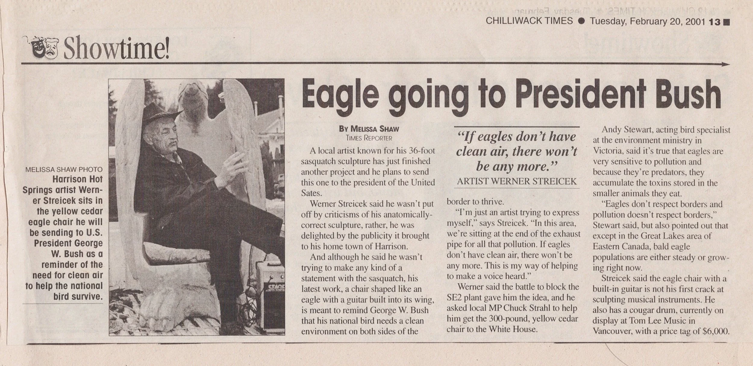 Werner created Bald Eagle Chair from a discarded stump of Yellow Cedar, as both a genuine homage to the musical culture of the United States and a commentary on the most resource-intensive country on the planet, per capita.